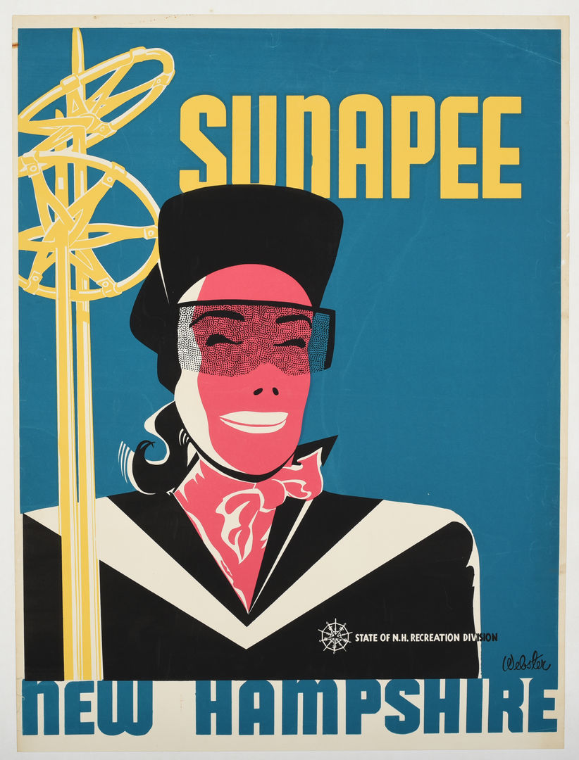 The State of New Hampshire has always promoted their White Mountains, and amazing ski resorts. This poster was created early in Mt. Sunapee's history. According the NewEnglandSkiHistory.com, Downhill skiing activity on Sunapee dates back to 1933, when the Civilian Conservation Corps constructed the Newport Ski Trail on the eastern side of the mountain. Built under the supervision of the Newport Ski Club, the trail dropped some 1,500 vertical feet to the Newbury railroad station. The trail was partially relocated in the late 1930s by the Society for the Protection of New Hampshire Forests and Newport Ski Club and was renamed the Newbury Ski Trail. This Poster rarely comes up for auction, but is a fantastic early one.